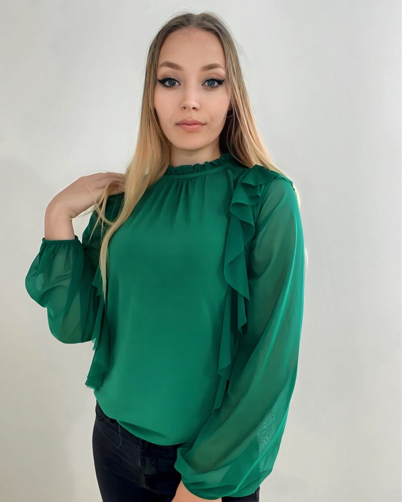 Bluză elegantă cu mâneci lungi translucide, guler încreţit şic pe gât şi volane romantice.